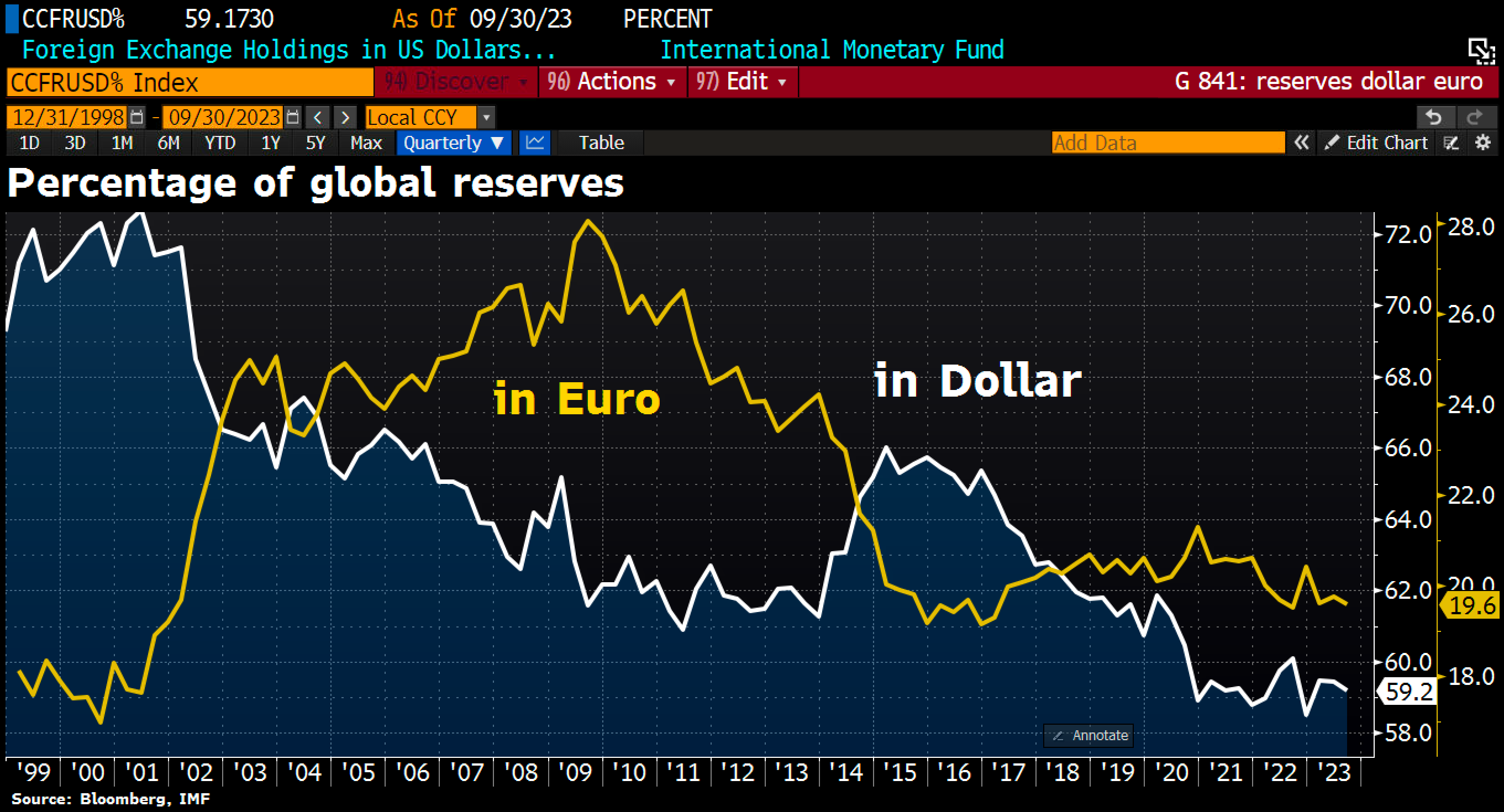 In Q3 2023 the Dollar's dominance declined to 59.2%, a slight decrease from Q2 and its lowest point since Q4 2022. Simultaneously, the Euro saw a marginal reduction to 19.6%. Meanwhile it is getting quite around a unique BRICs currency although the process of de-dollarizations moves on.