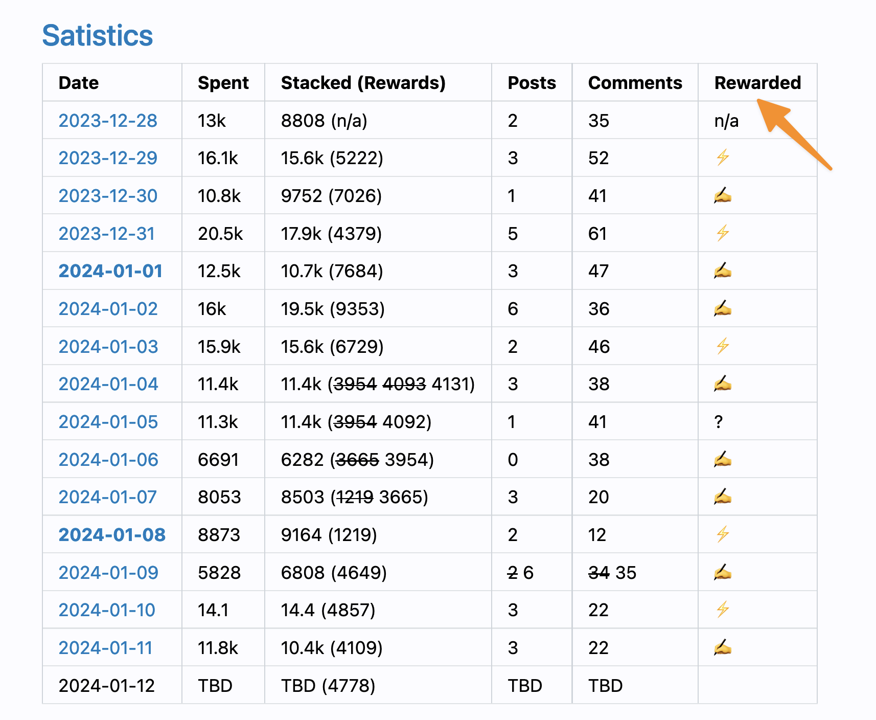 | Date | Spent | Stacked (Rewards) | Posts | Comments | Rewarded |