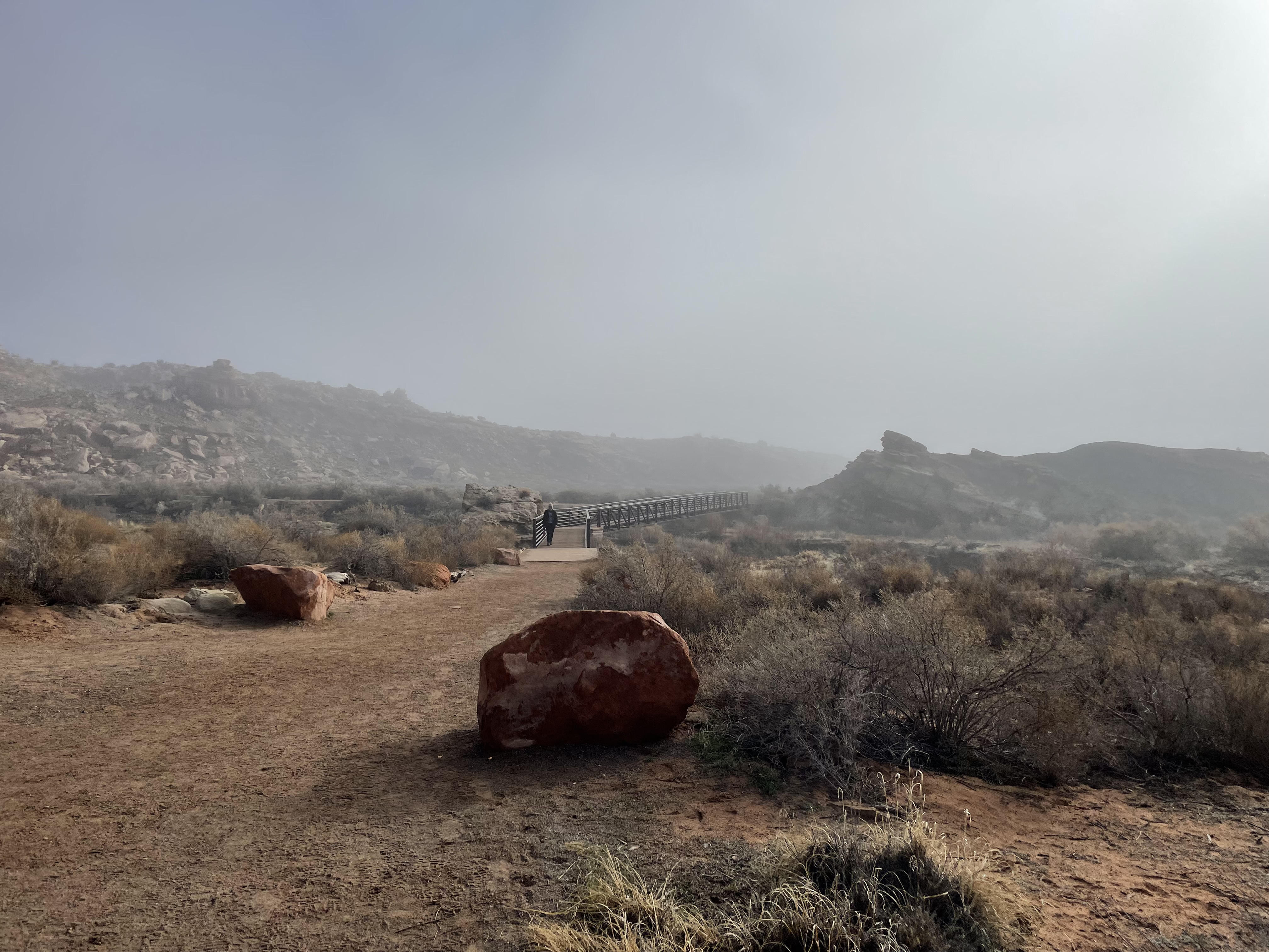 It was early and cold when we reached the park, but we were just glad that it wasn't raining and we could see the blue sky. We wanted to hike the Delicate Arch trail and see the famous Utah license plate arch up close. The trail is an easy to moderate difficulty out and back trail that is 5km long with about 190m elevation gain. As it is a popular trail, to avoid the crowds and to find a parking spot easier, we decided to drive directly to the Delicate Arch trail trailhead right after our quick stop at the visitor center for picking up junior ranger workbooks. As we were driving to the trailhead, it started to fog up and the fog lingered even when we started our hike. Just as I was starting to worry that our views of the surrounding landscape will be obstructed, the sun did quick work of eliminating the fog and we had perfect visibility.