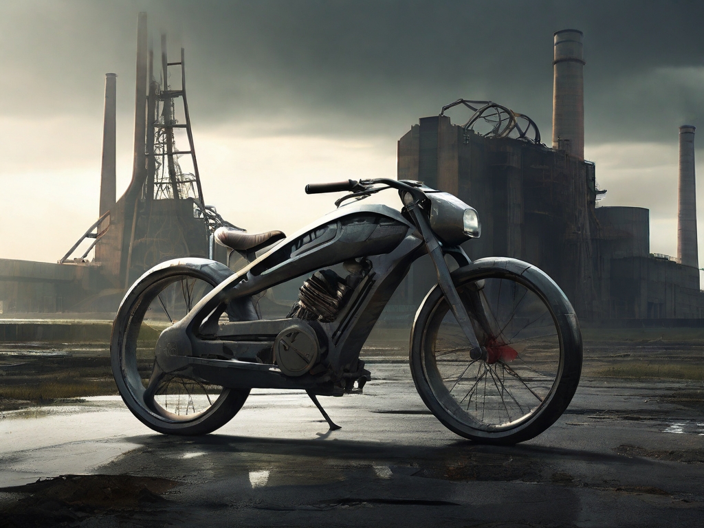 A sleek, futuristic bicycle gleaming in the harsh light of a post-apocalyptic world, its expensive price tag a stark contrast to the decaying nuclear power plant looming in the background.