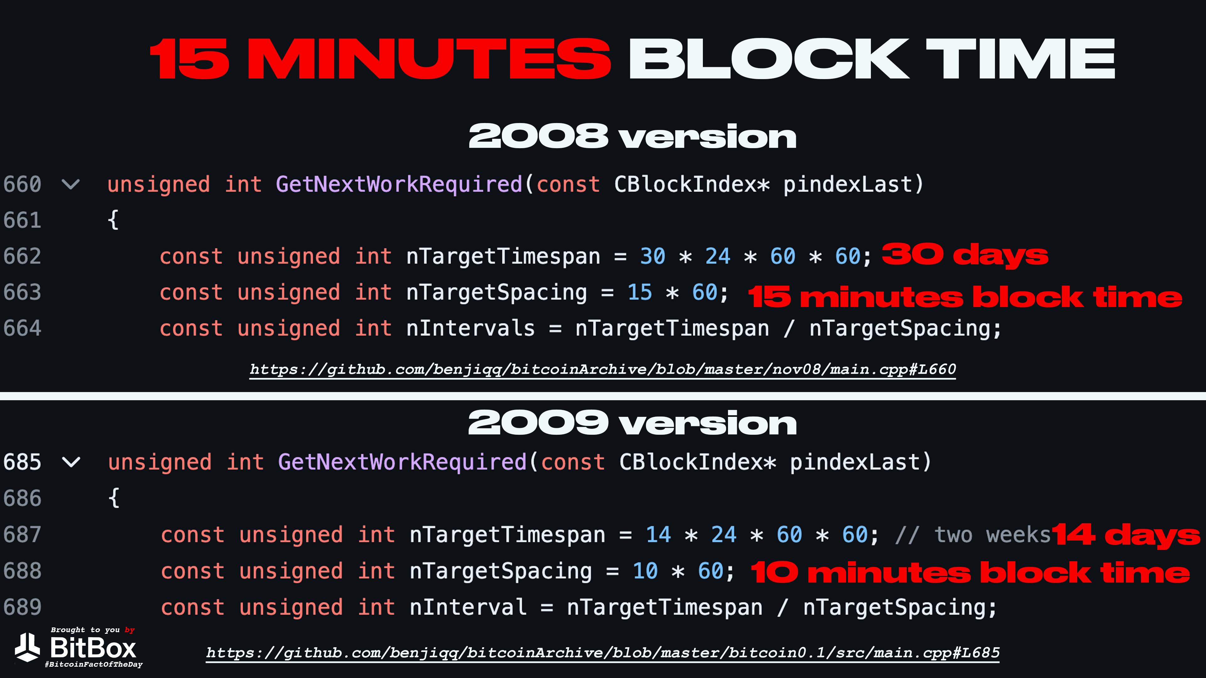 One interesting fact is that the block time initially was to be 15 minutes and the difficulty would have adjusted once every 30 days.