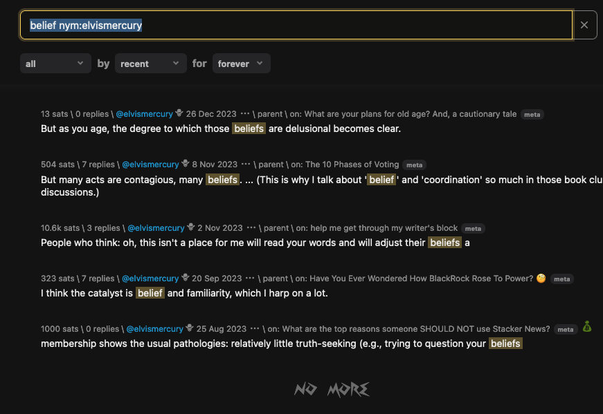 I'm getting ready to do another experiment and I've been trying to unearth some old posts and comments that I made. I remember saying a particular thing about "belief" so I tried to search for that: