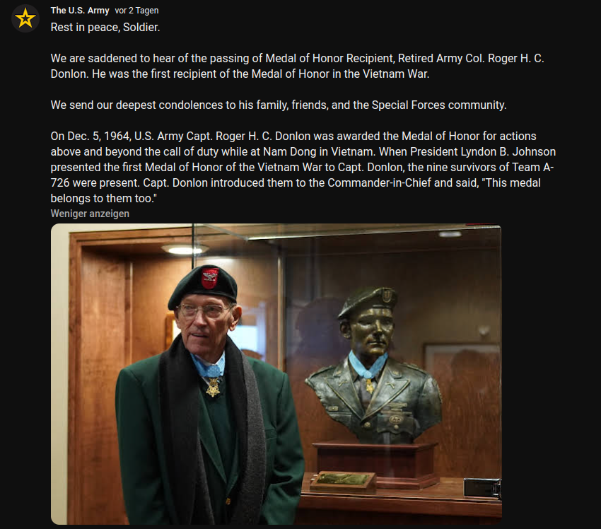Captain Donlon became the first American to be awarded the Medal of Honor in Vietnam for killing two VC sappers and thereby preventing them from breaching the Nam Dong base, while sustaining shrapnel wounds in the process.