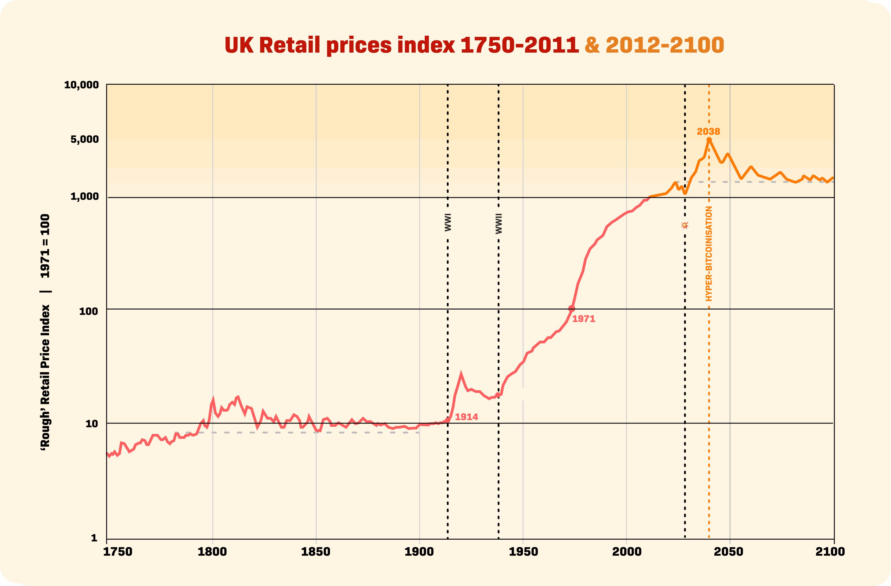 Capital controls of the 2020s for Western and Asian countries had yet to be fully lifted and not all people had yet shaken the view that politicians had a duty and need to subsidise their income. This unfortunately led to the continued degrading of fiat purchasing power, with retail prices going up 5x between 2028 and 2038. Causing more and more people being onboarded to Bitcoin.