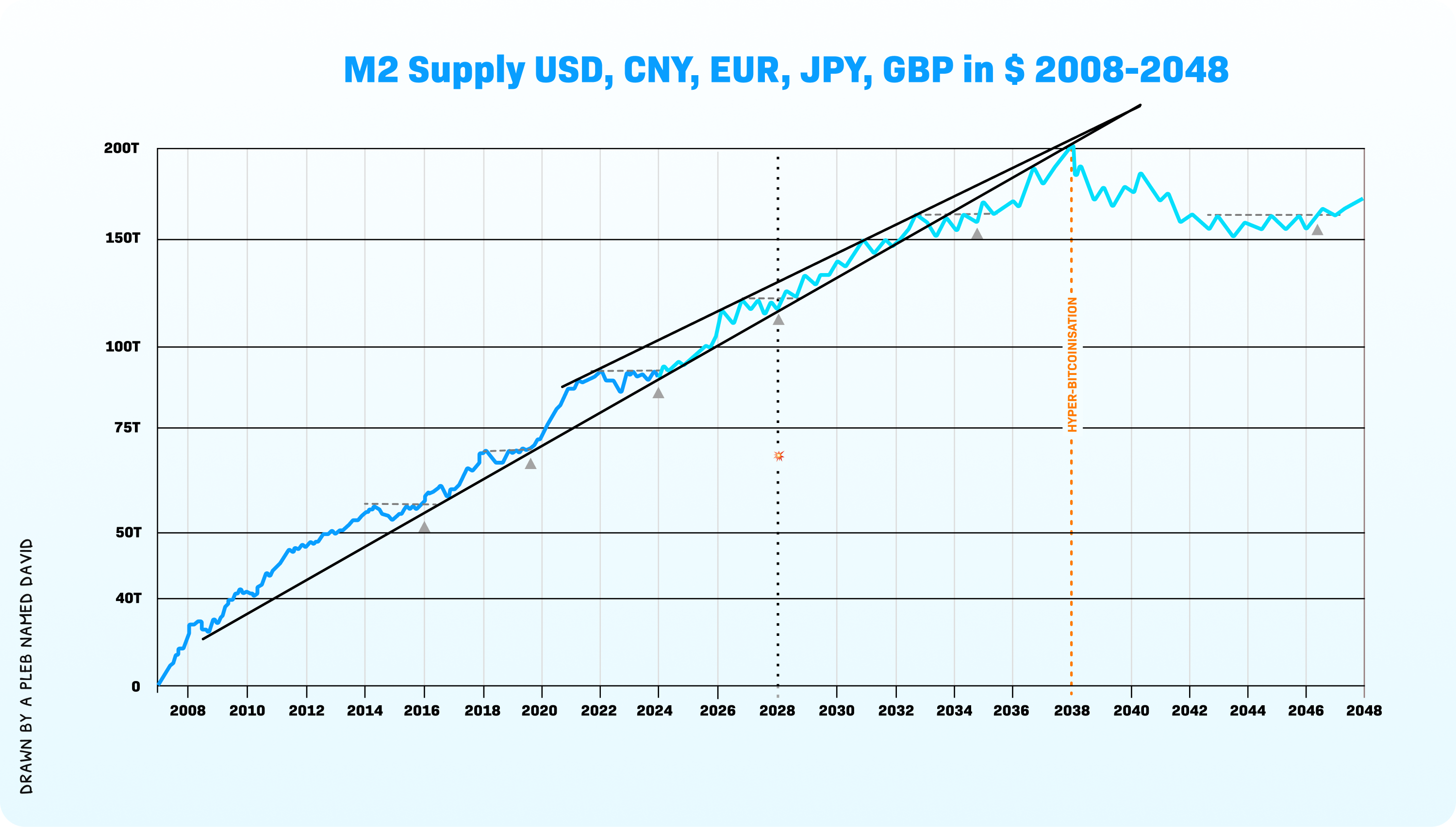 You needed not look further than the M2 money stock of the Top 5 most traded currencies at the time, the USD, CNY, EUR, JPY, GBP - adjusted into dollars. A new printing frenzy happened in 2024, marked by the 3rd grey triangle illustrated, with the total stock of these currencies reaching a top of 200 trillion dollars just 14 years later. More than doubling in that time. Such a figure acted like a wall however, with both the market and hyperbitcoinisation later forcing what was left of these countries into adopting the asset and into complete currency reform.