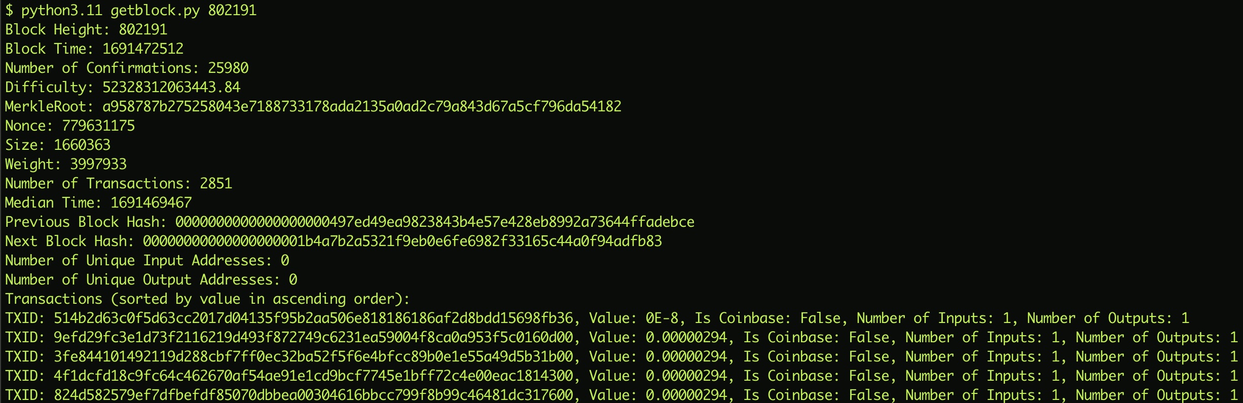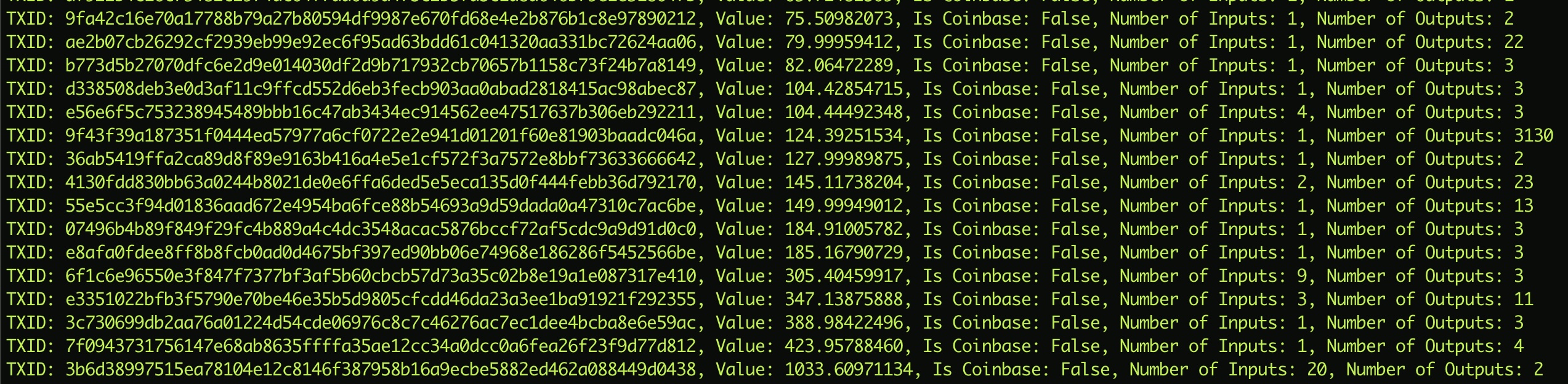 print(f"TXID: {tx}, Value: {value}, Is Coinbase: {is_coinbase}, Number of Inputs: {number_of_inputs}, Number of Outputs: {number_of_outputs}")