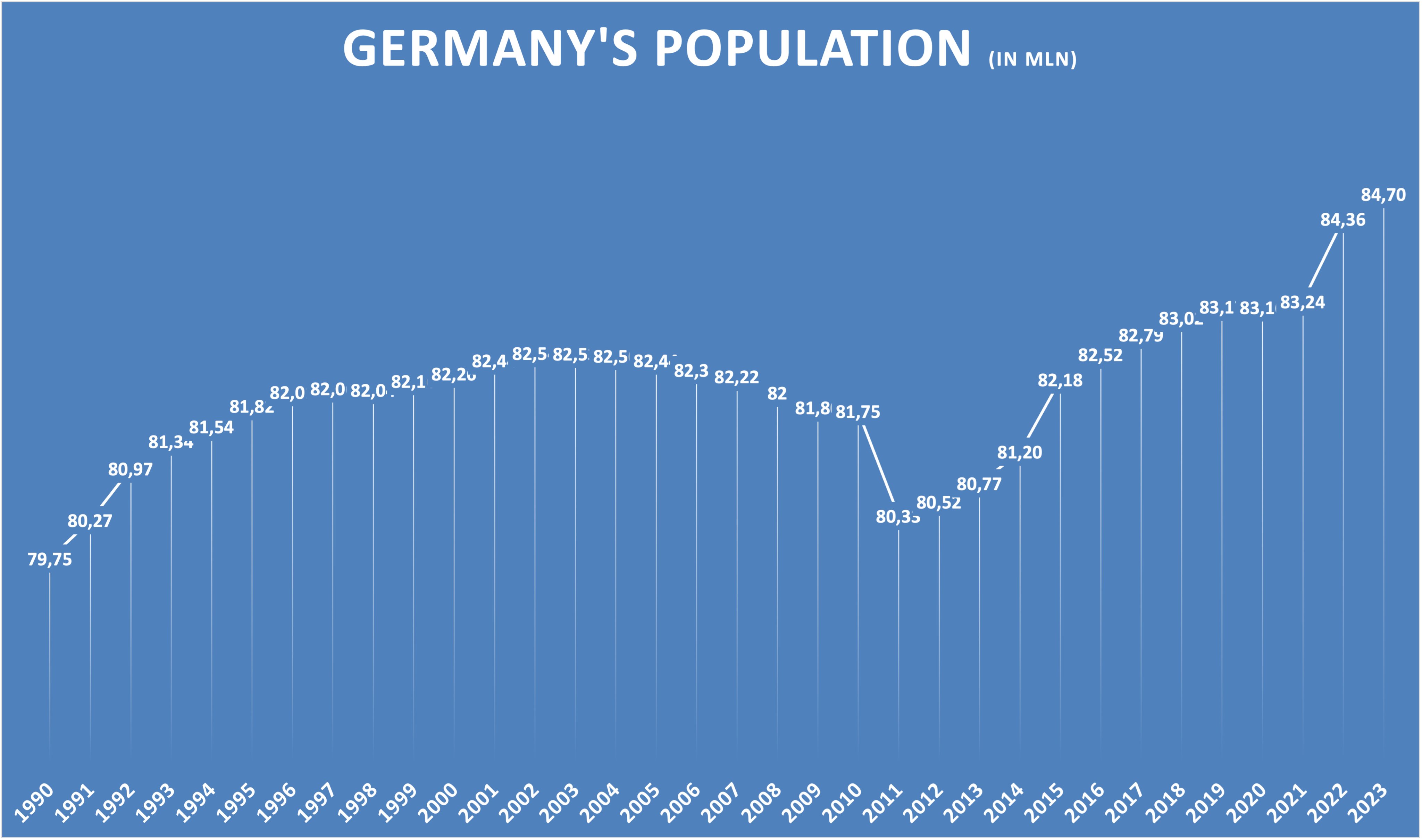 German society is actually stuck in a demographic trap and should be shrinking. The significant increase in the total population in recent years points to illegal immigration, which will hit Germany like a sledgehammer. The majority of new migrants are financed exclusively by social security allocations. The per capita income of the country, which has long been mired in recession, will continue to shrink as it has in recent years. There is no solution to the migration crisis as the globalists from Davos, who have infiltrated all EU governments, have no interest in solving this problem.