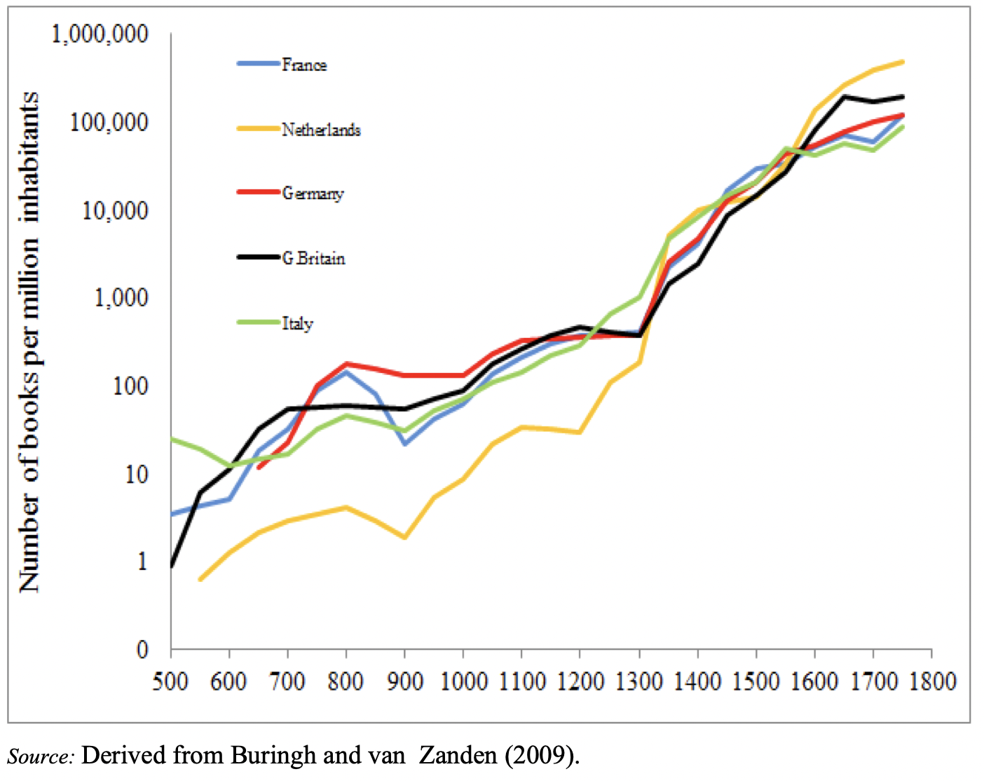 Found this interesting paper/report. About 120-150 books were written in the whole Europe in the 7th century, about 20 millions books printed in the 18th century. A printing press invented by Johannes Gutenberg in 1440 changed everything - a sort of Bitcoin of that time. A great price deflation followed, the second plot: book prices dropped by massive 85-90% during the 15th century.
