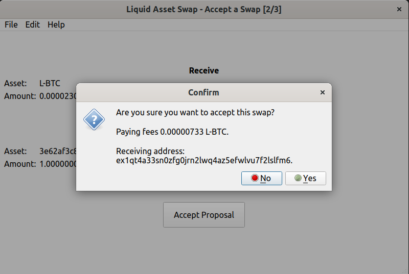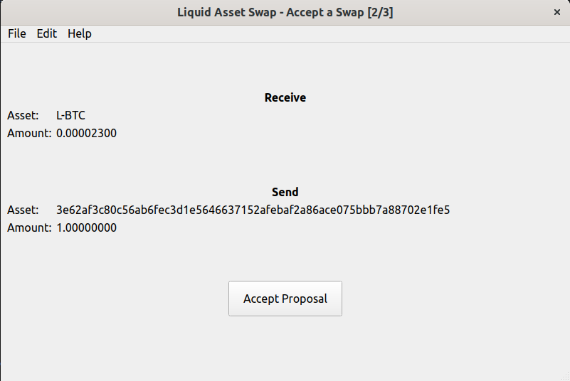 $ liquidswap-cli -u http://$E_RPCUSER:$E_RPCPASS@localhost:7041 propose -o proposal.txt 3e62af3c80c56ab6fec3d1e5646637152afebaf2a86ace075bbb7a88702e1fe5 1 6f0279e9ed041c3d710a9f57d0c02928416460c4b722ae3457a11eec381c526d 0.000023This file was exported to proposal.txt and transferred to Node2 (the customer), which was then inspected:
