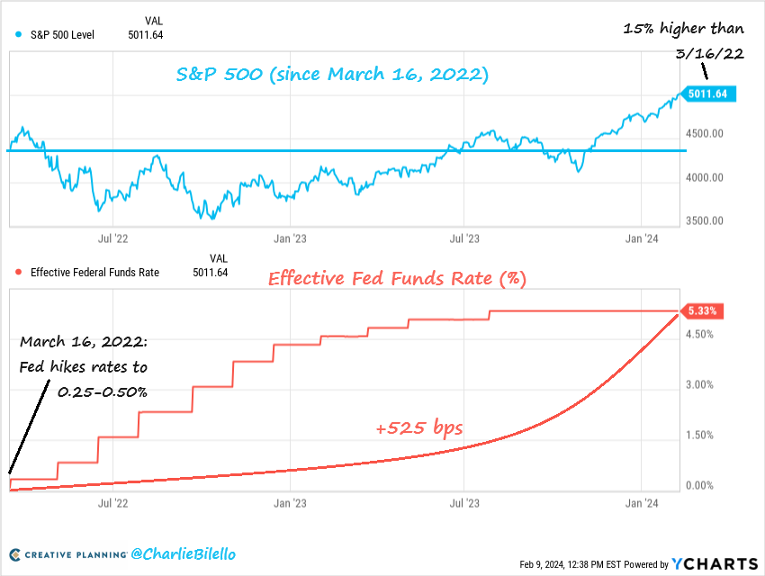 Clown world money manipulation! The S&P 500 is now 15% higher than where it was when the Fed started hiking rates in March 2022.
