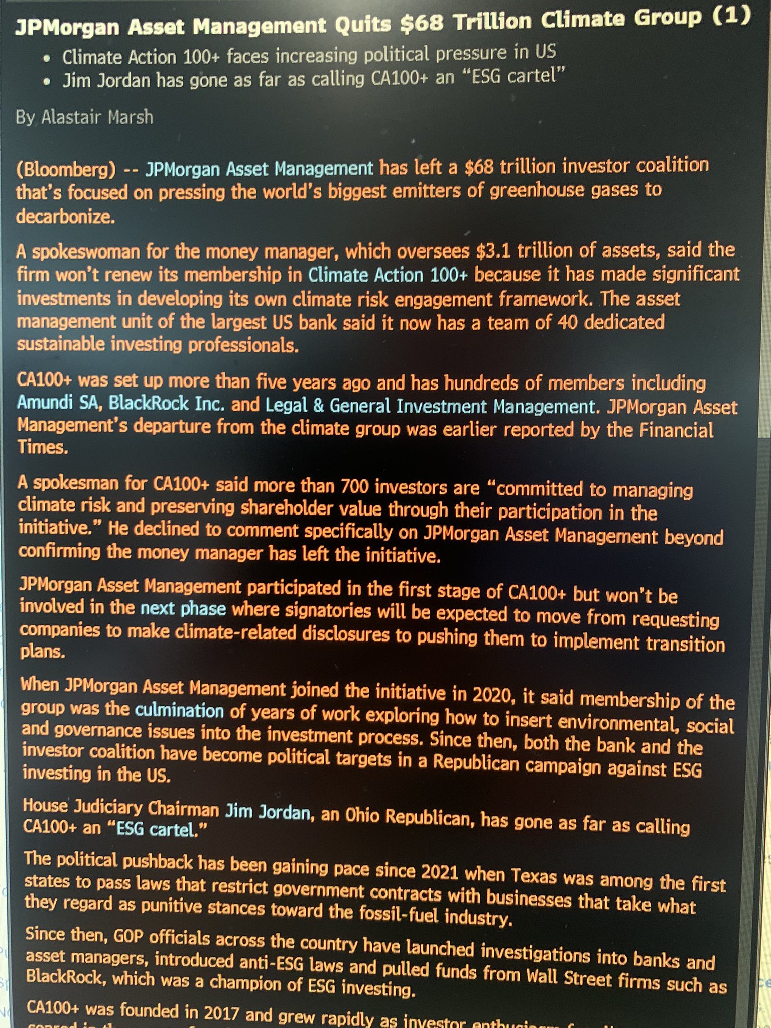 I already reported last year that the market for ESG investments had corrected significantly. The corresponding ETFs have seen significant capital outflows globally. With JP Morgan's decision to withdraw from the 'Climate Action 100+' investment fund, it is becoming increasingly clear that the nonsensical climate policy steered from Davos is coming to an end, as it will at best provide investors with fragile subsidy flows that come with considerable potential for political blackmail. If a player like JP Morgan decides to do this, then it's only a matter of time before other big players realize that they may be sitting on a sinking ship and it's time to pack their bags.