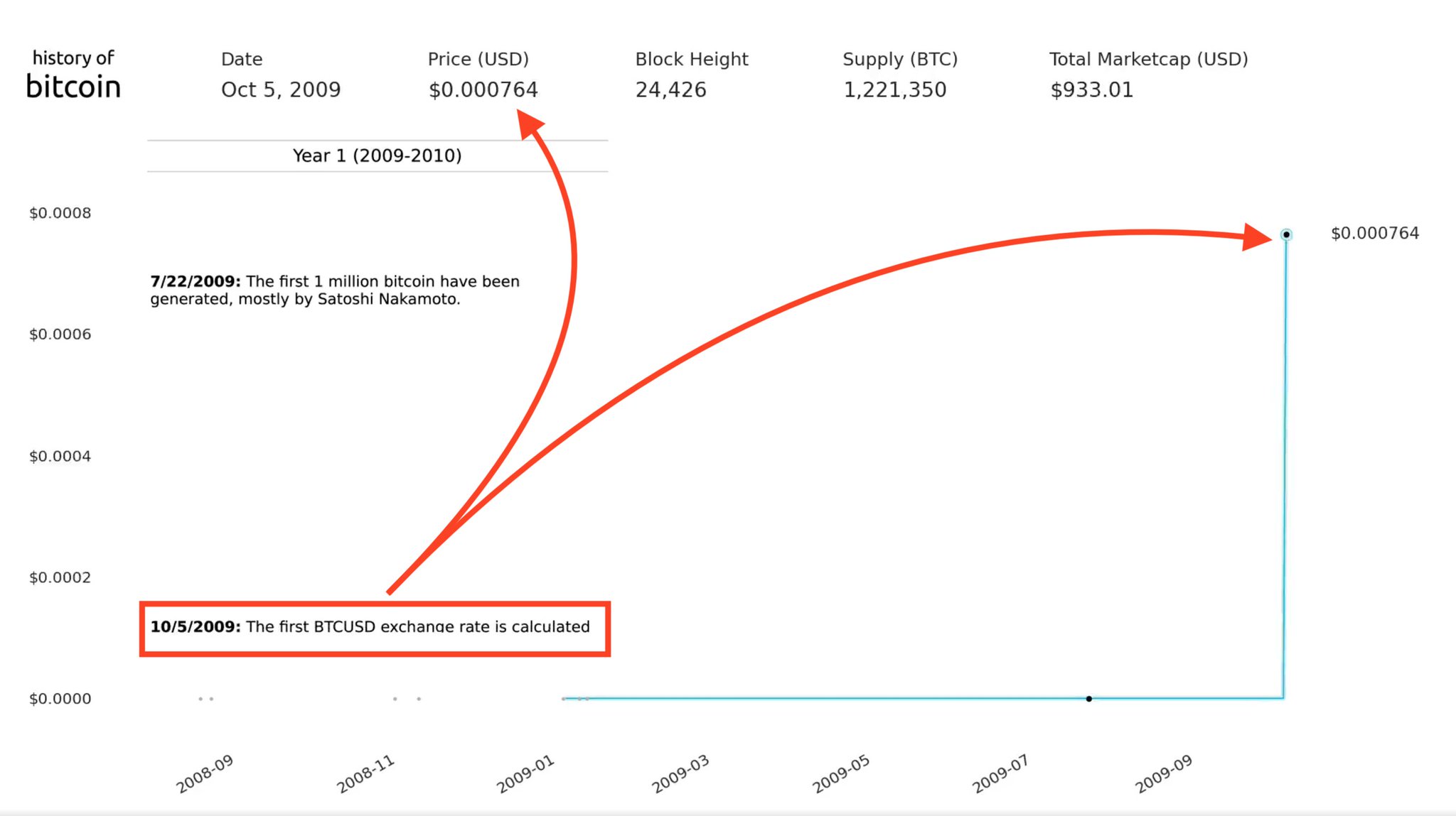 October 5, 2009 - First BTC/USD exchange rate is calculated