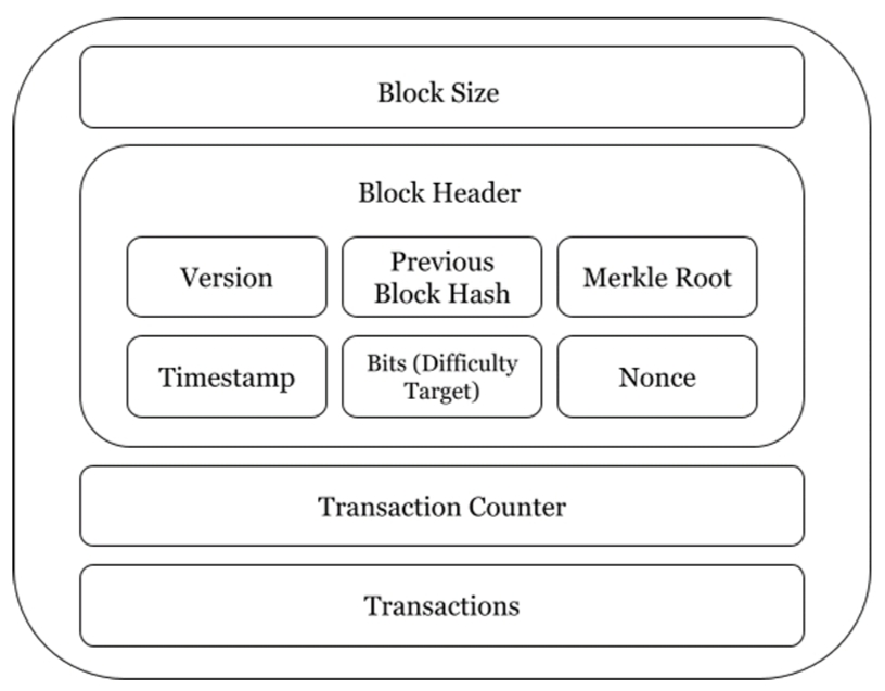 ● “Merkle Root” denotes the root of a Merkle tree, which summarizes all transactions in the block.