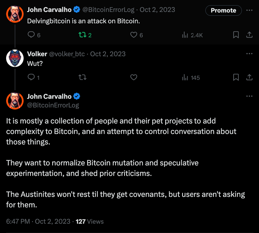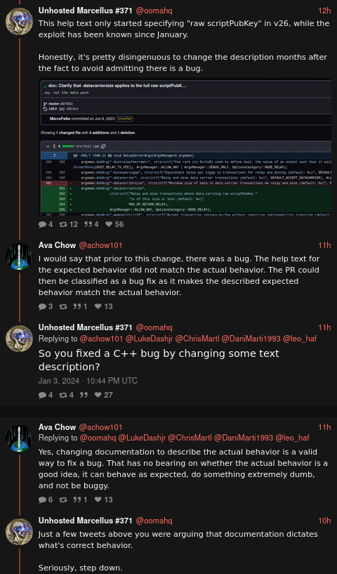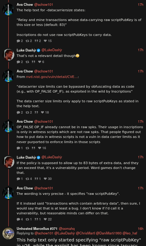 datacarrieranddatacarriersizeconfig options to Bitcoin Core back in 2014. They redefined the meaning of his contribution in his face to be able to reject his new work more comfortably.Here's some Twitter receipts of Ava Chow arguing that the "inscription bug" is fixed due to the "amended" meaning of