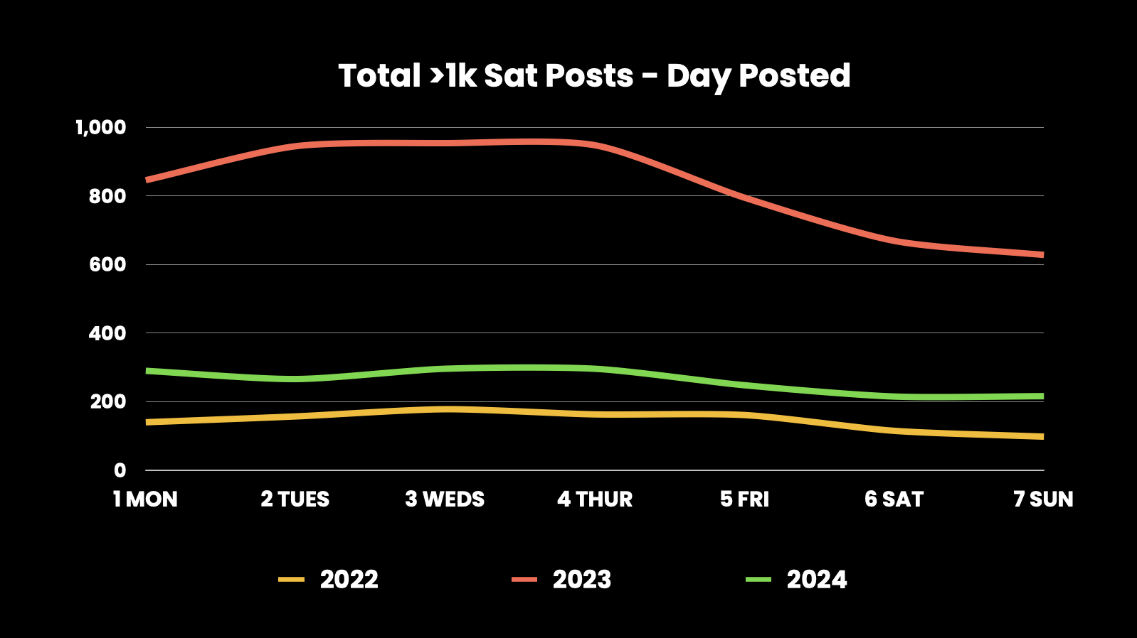 The above graphs are suggesting we have ourselves some sticky users, with consistent sats every day of the week in 2024. Stacker News is definitely gamifying our stacking habits, damn you @k00b, @kr, @ek & team. 2023 shows an opportunity on Sundays for posting, with fewer high-value posts in number at that time. Saturdays and Mondays stackers are slacking.