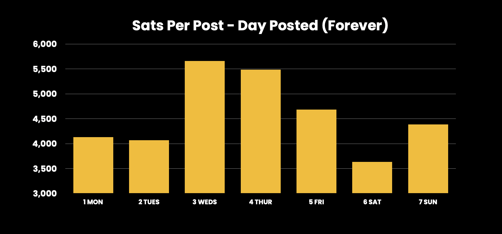 It looks like posting on Wednesdays, Thursdays & Sundays is a great way to get an additional boost of sats when sharing engaging content on the site. For discussions & comments, Mondays and Fridays are the standout candidates.