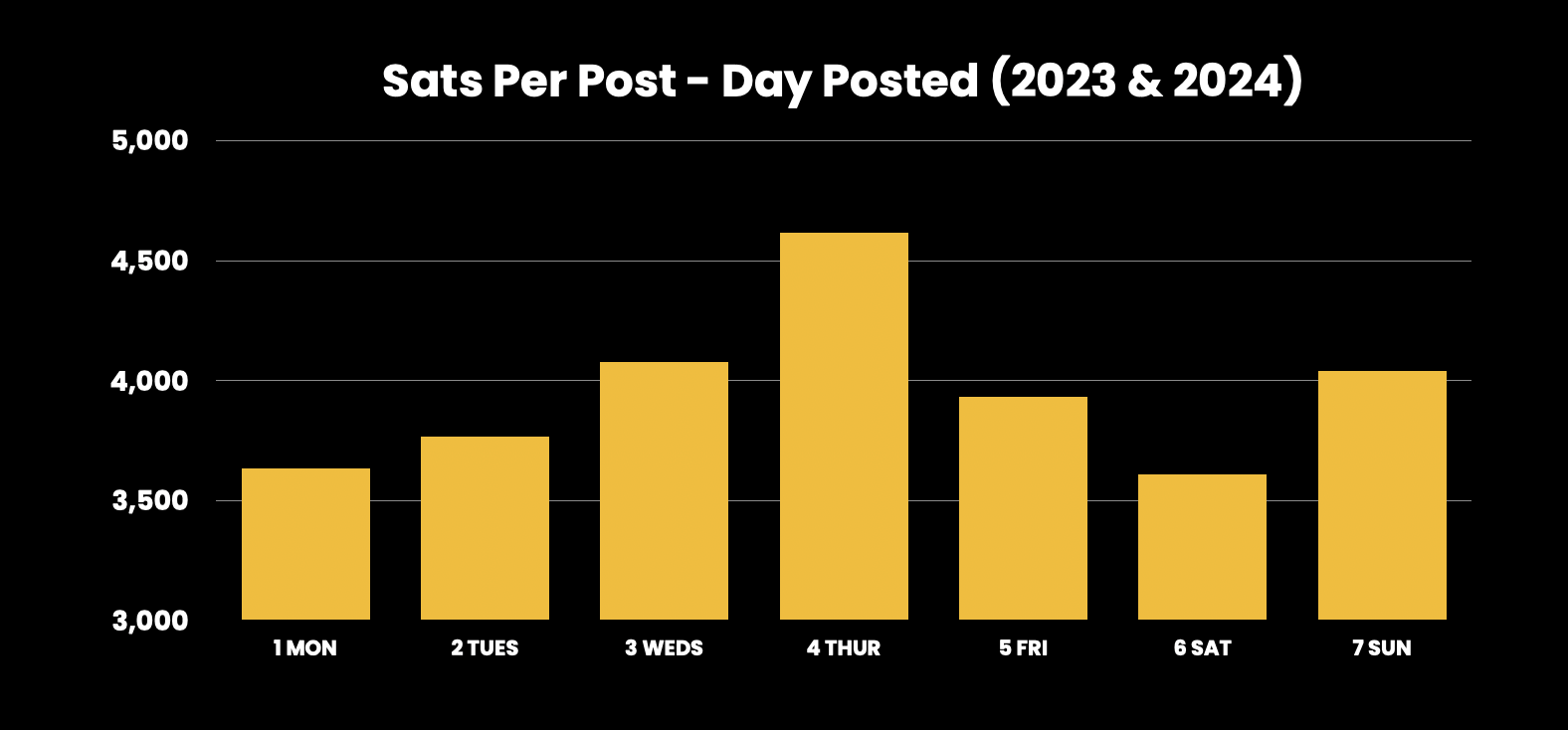 Days: Posting on Thursdays generates more sats (16% extra), with Wednesdays and Sundays also favorable. Saturdays and Mondays see fewer high-value posts.
