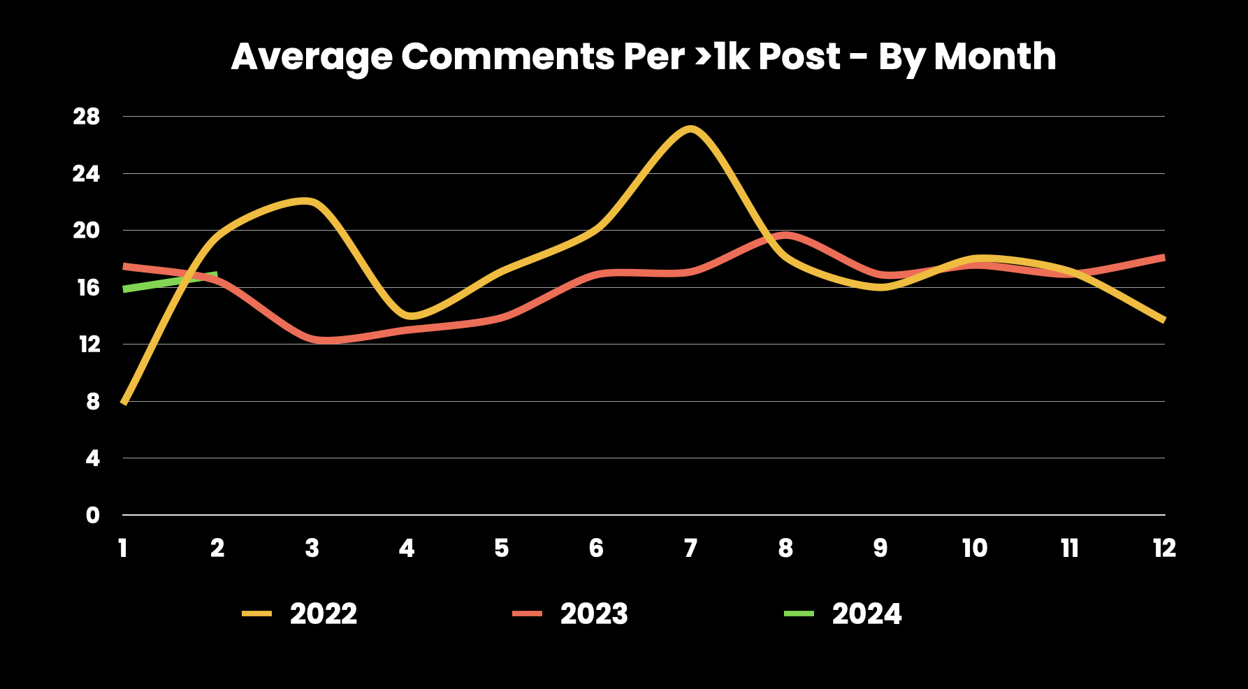 The number of comments per post is intriguing also, since there isn't a huge difference between years. The curve seems to be flattening between months, with 2024 having an average of 16.1 comments per 1k sat post. On track to be between 2022 (17.2) & 2023 (16.6).