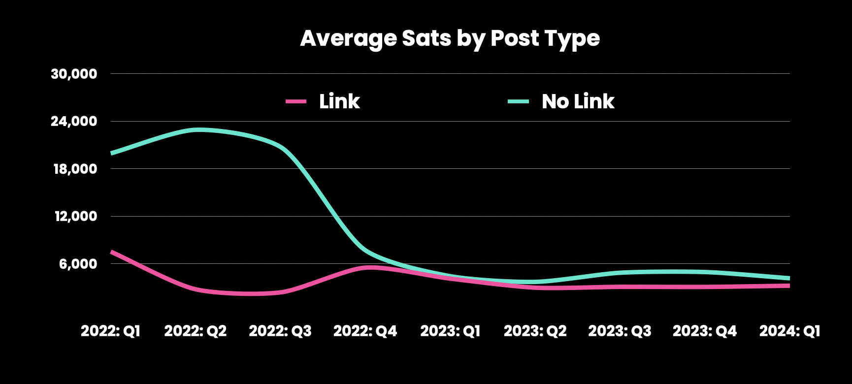 The average sats per post in 2024 (3.8k) are close to 2023βs figure (4.0k), despite the increased value of sats.