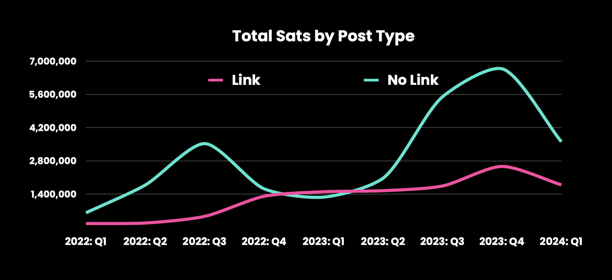 Links: Posts without links generate significantly more sats (5,713 vs. 3,365) and have more comments (22.1 vs. 8.1). Writing original content without links is a strategy for higher engagement.