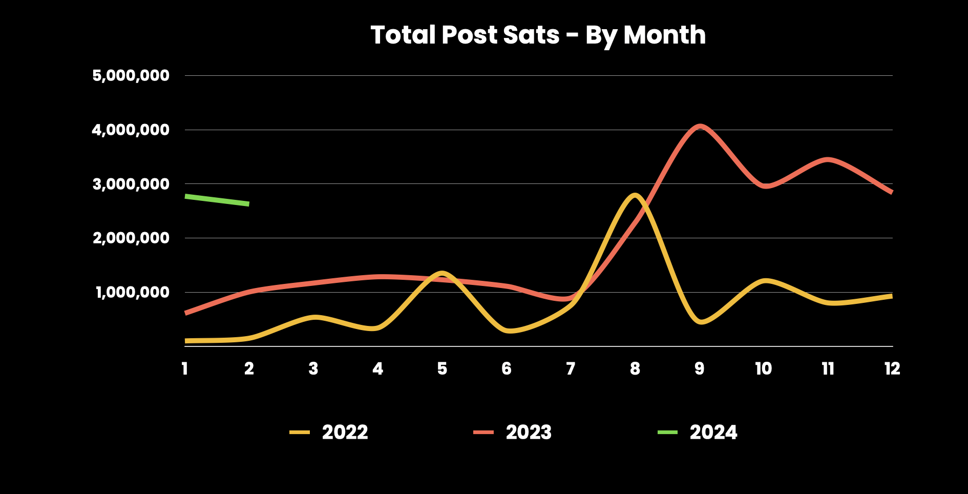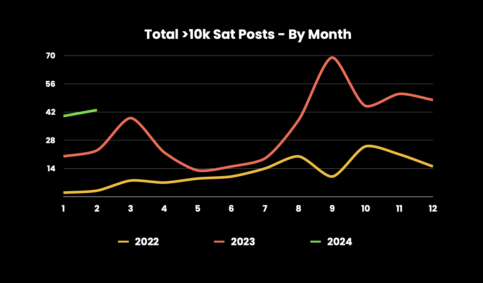 2024 Growth: 2024 has already seen more posts with over 1k sats than all of 2022, signaling strong growth. However, posts with >10k sats are fewer in 2024 compared to 2023 but could surpass previous records.