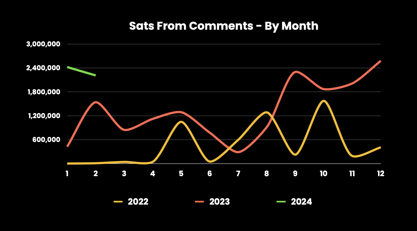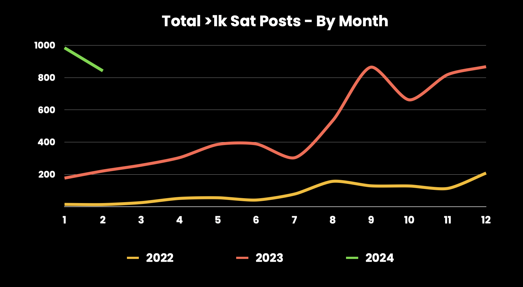 In 2024, with not even 2 full months completed, there are already way more >1k sat posts on Stacker News (1,816) than the entire year of 2022 combined (1,009). 2024 has started off with a bangπ₯