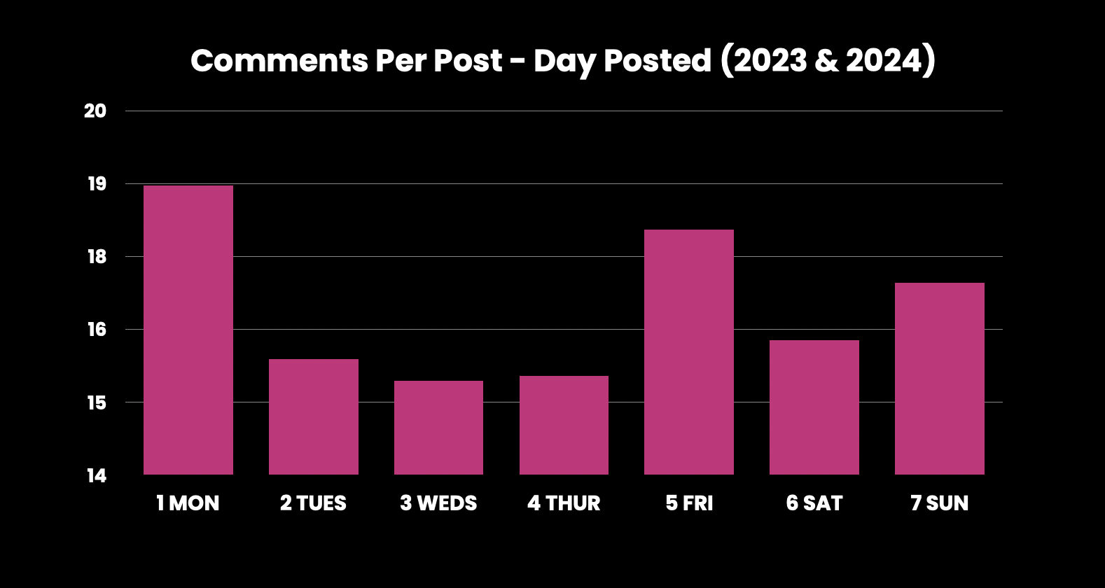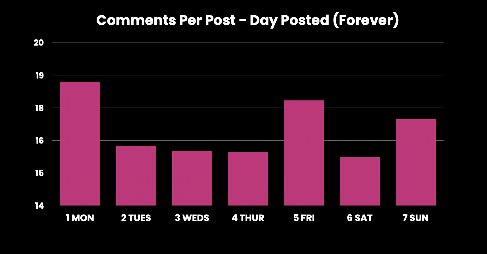 I feel that Mondays and Fridays may gravitate towards discussion because of Meme Monday and Fun Fact Friday respectively. These are evergreens that pull in a crowd, week in week out