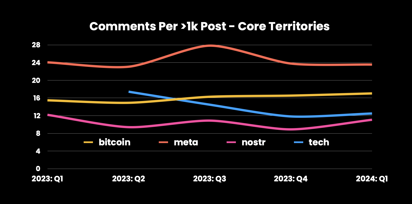 Bitcoin, Nostr, and Meta territories are popular, with Meta posts generating more comments. The Tech territory has the lowest sats per post.