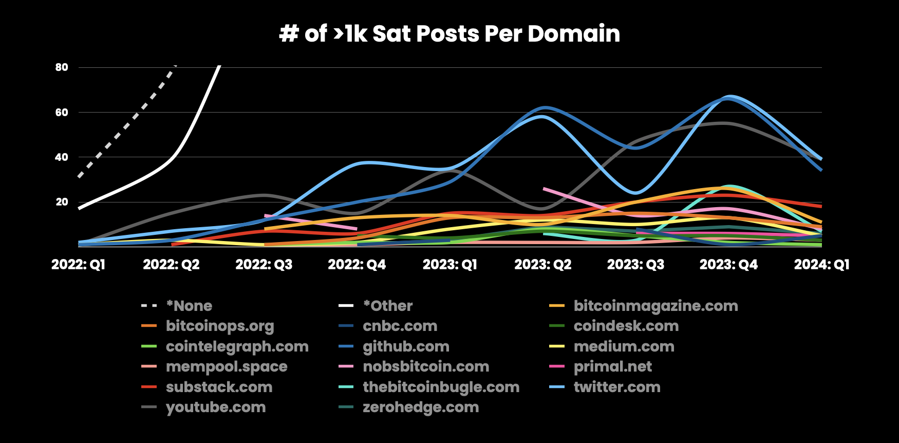 Not much can be derived from the domains shared each month, but I'm still a fan of these sat-ghetti graphs myself. It should be noted similar domains have been merged (twitter.com with x.com) wherever possible. Primal had a recent flurry of sats thanks to @Darthcoin's Zeus anniversary post here on SN. Since Q2 2023, people have been surprisingly focused on mempool.space, be it sharing specific mining blocks, transaction fees or specific transactions like this one from @BlueSlime with increasing popularity.
