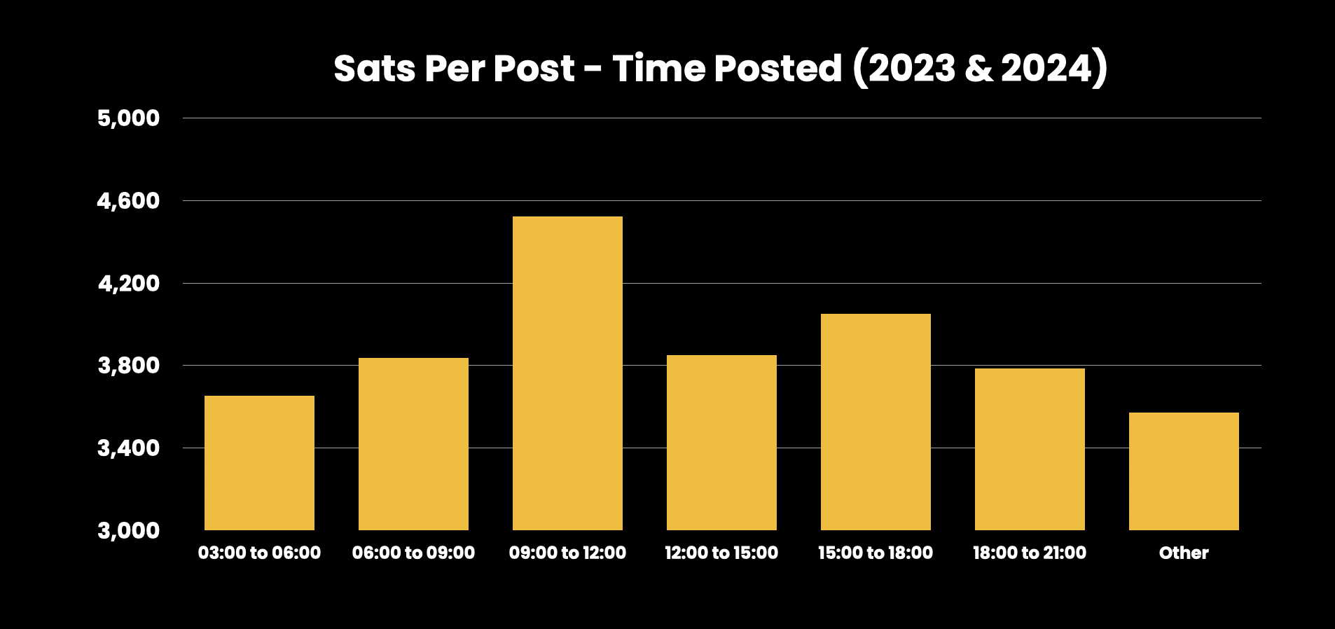 It used to be the case that posting early morning for European hours would generate the most impact on the site. For 2023 & 2024, posting between 9am and noon Eastern Time is CLEARLY optimal, leading to 4,523 sats per post on average, vs 3,978 sats on average for other times overall. That's an extra 14% for posts with 1k or more sats. For posts with 10k or more sats, it seems that stackers have generated an extra 24.8% by simply posting between 9am and noon ET π .