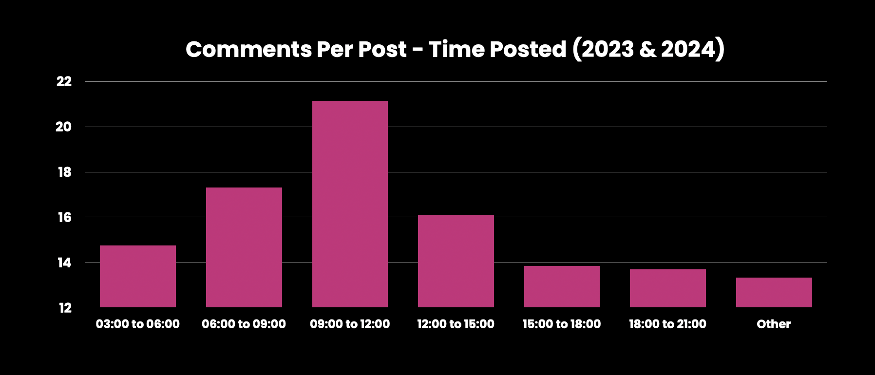 The same is true for comments. 21.1 average comments when posting during 9am to noon ET, vs 16.5 comments on average any other time of day (27% up).