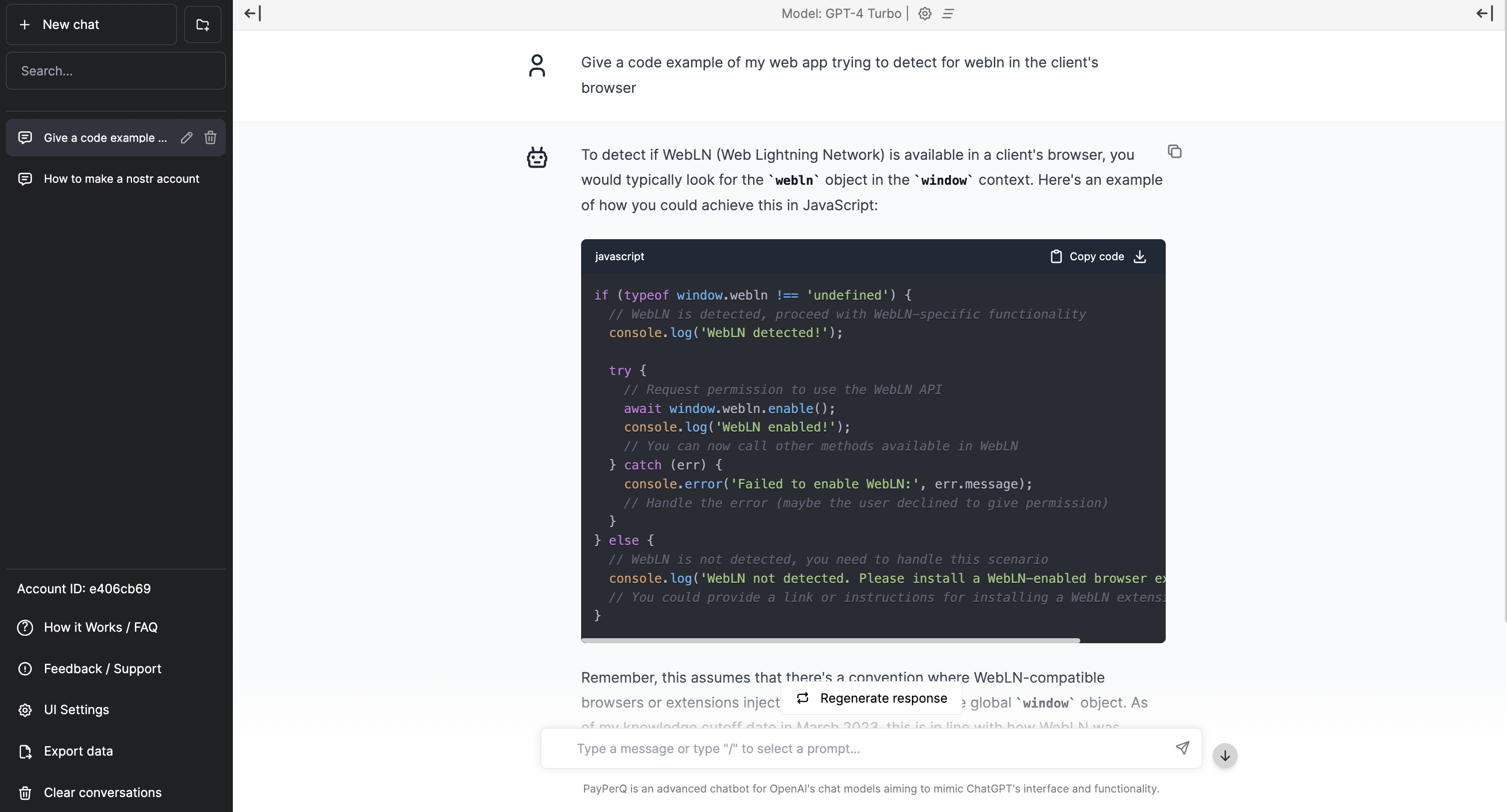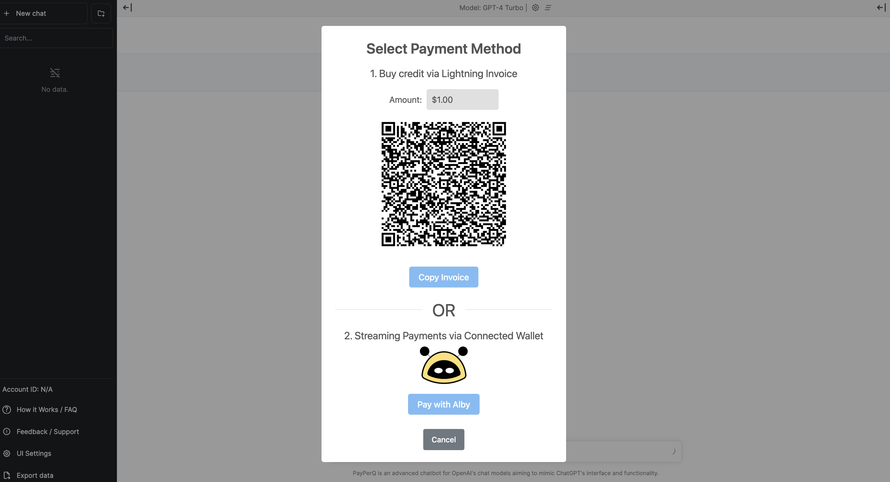 Hey all, I’m really excited to introduce PayPerQ (ppq.ai), a vanilla ChatGPT4 experience which operates on a pay-per-query model via lightning payments: