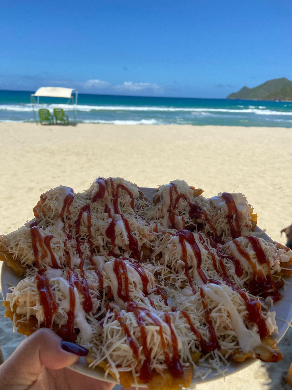 Photos that a friend sent me because she knows how much I miss walking along that path of palm trees and eating tostones with fried fish on the beach. Tostones are a typical food in Venezuela, they are made from banana, they are very delicious, on the coast they are usually accompanied with salad, cheese and sauces.