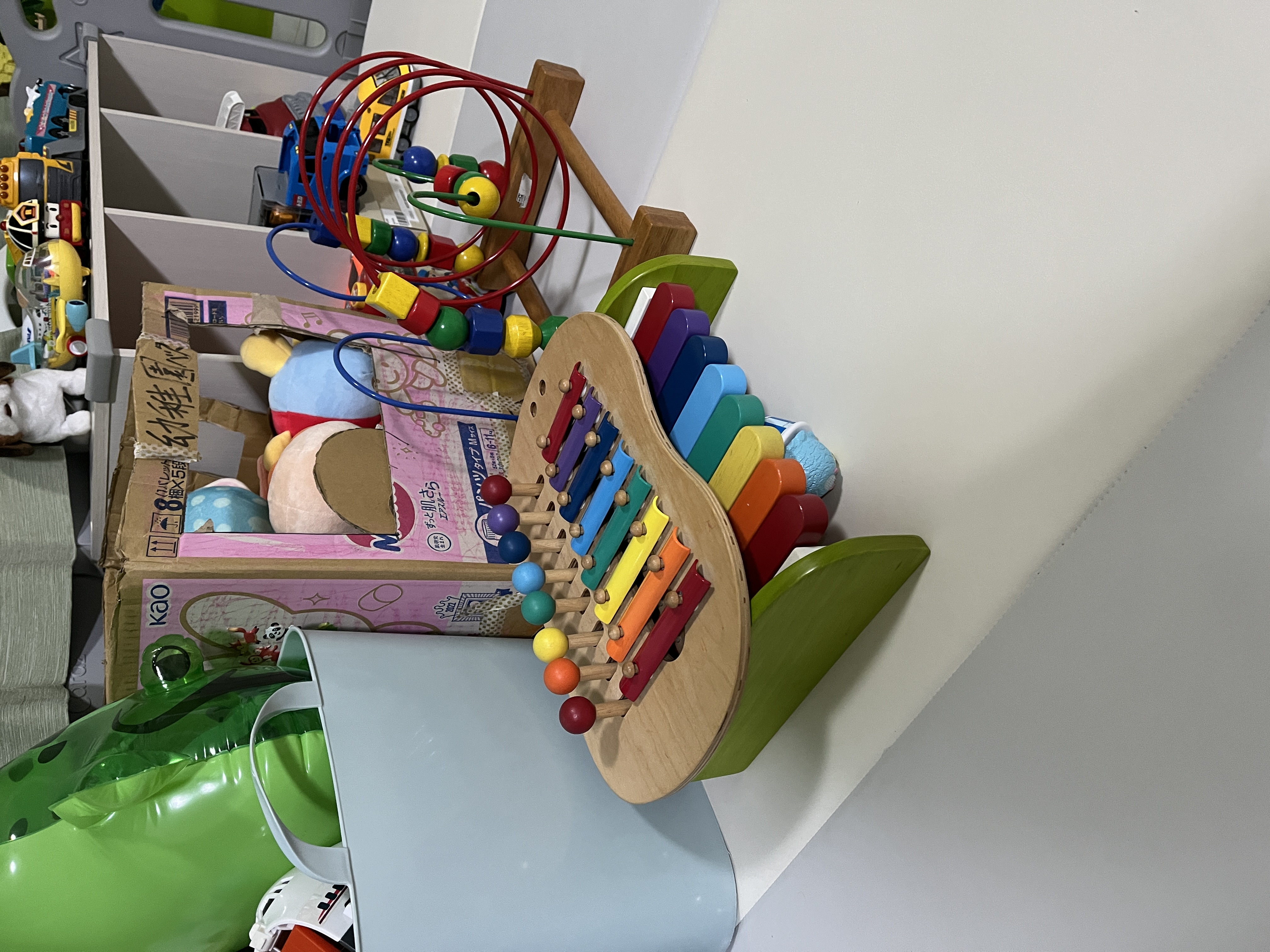 The playpen was in a mess, with toys scattered all over the place. I battled with the mess for 10-15 mins.