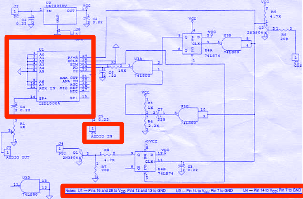 Additionally, this switches the transistor (Q2) to ground. When this happens, the U1's play/record pin goes low and puts the U1 into record mode.