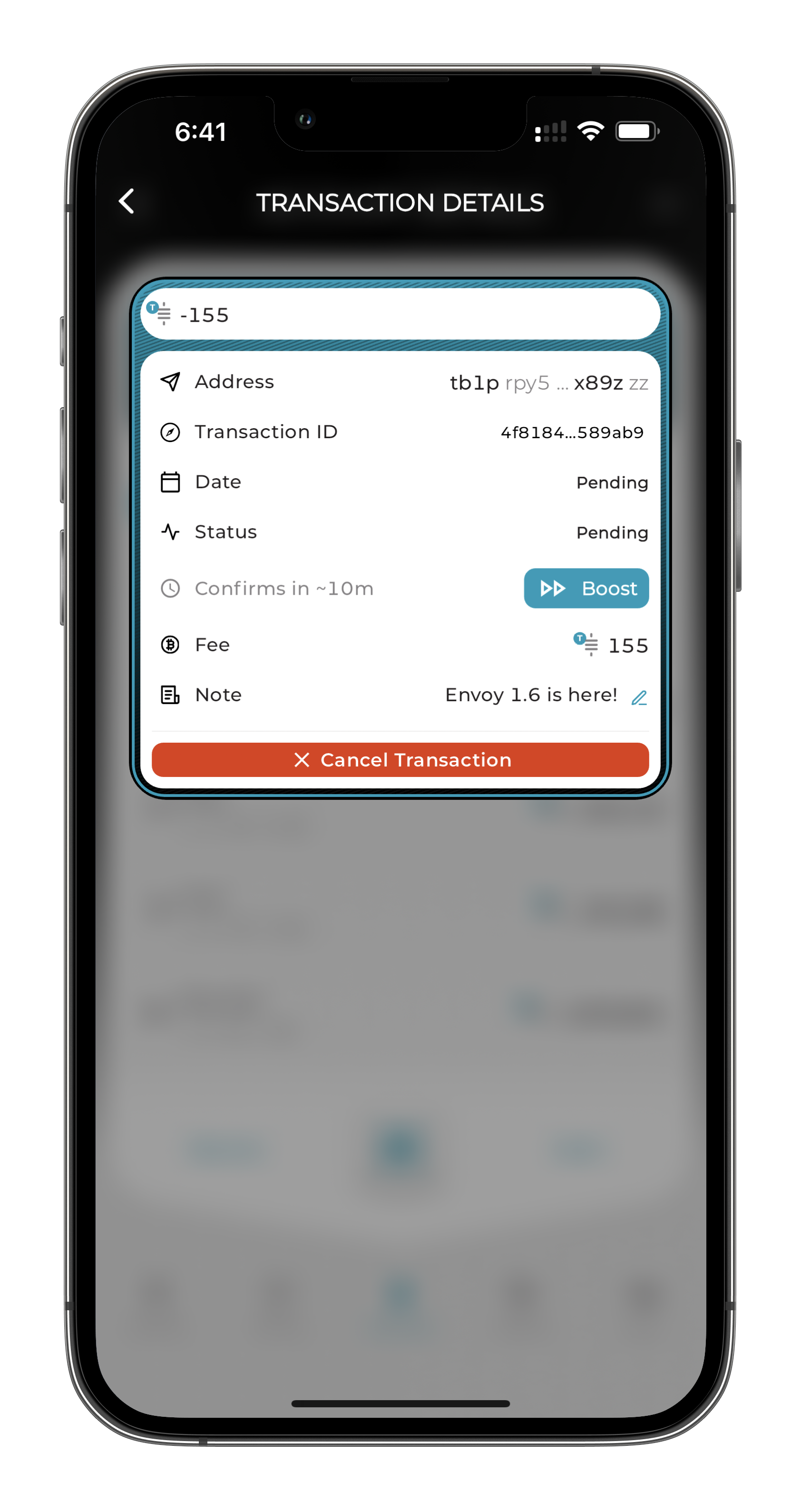 RBF allows you to boost the fee on a transaction you’ve sent that’s stuck surfing the mempool, or even cancel an in-flight transaction and send it back to yourself. Just tap on a transaction that is unconfirmed and quickly Boost or Cancel it in Envoy.