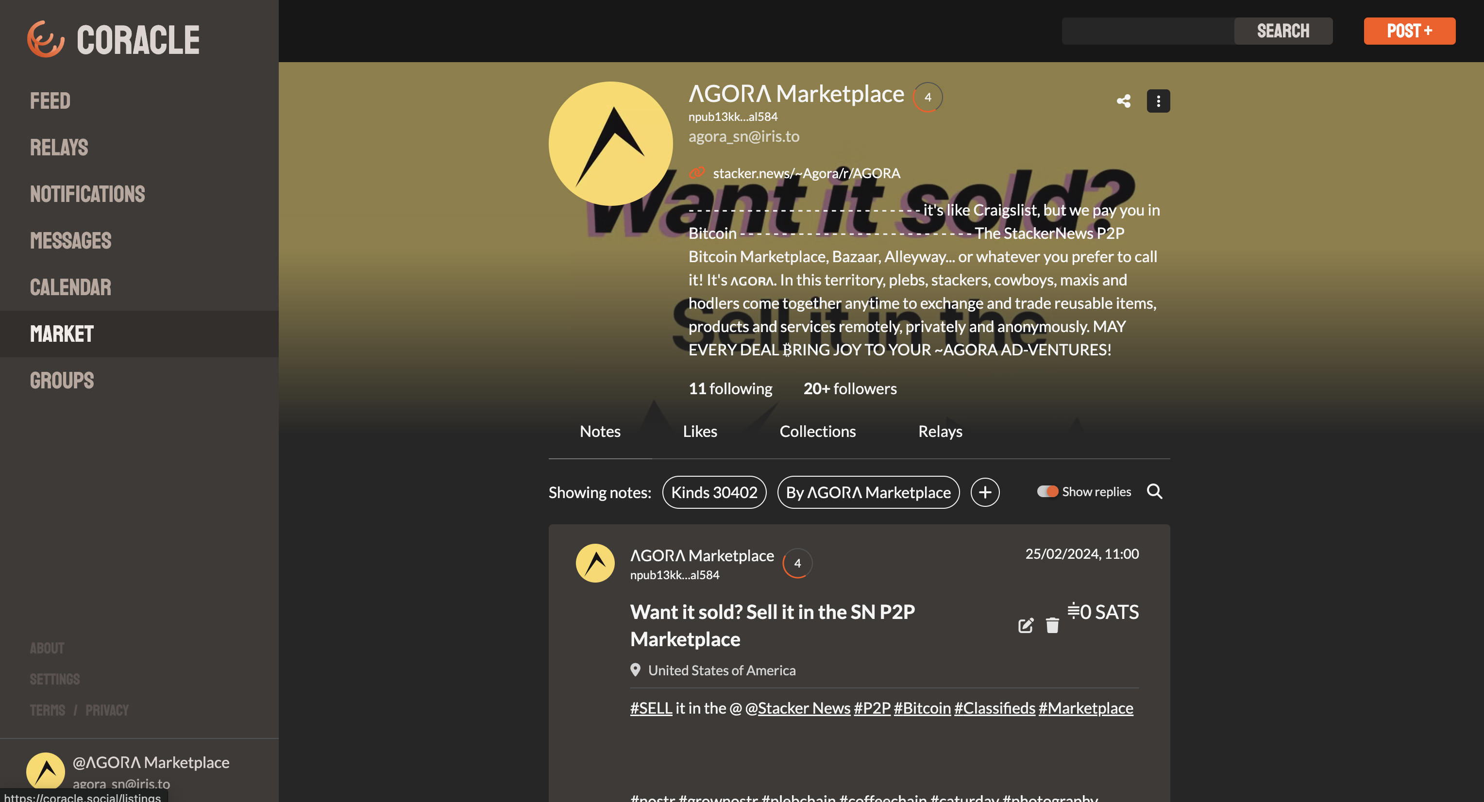 The first one getting my attention a while ago was CORACLE. It has a MARKET tab just there, available to anyone to start scrolling down a multitude of listings. The good fact, in this case, is that the products are pre-filtered by default, showing only those posted by nostriches you follow. Isn't that an ingenious idea? It is, so the AGORA shop there look's something like this: