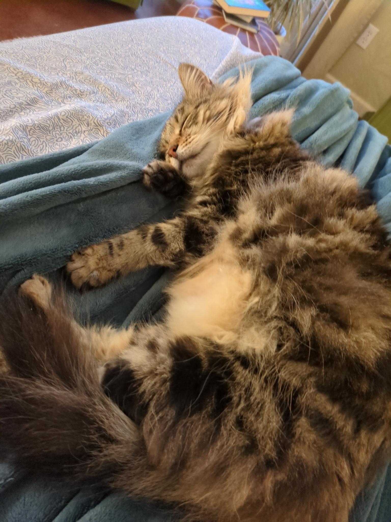 Katnis showed up at our house as a kitten with an infection in her eyes. She spent a lot of time sleeping on my shoulder. She's a Jekyll and Hyde. She can be the biggest chicken but also the most bold of our cats. She will run off males that are on her turf but will also act terrified by visitors or even me depending on her mood. She is the most demanding cat I've ever seen. If you do not pet her she will follow you all over the house trying to trip you. She will gently bite your feet and get progressively more persistent. She's a big cat but she's a big baby.
