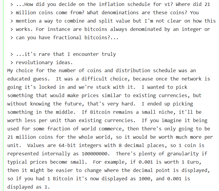 One of these more interesting emails from Satoshi outlines his logic for Bitcoin supply numbers and the issuance schedule. It reads below:One of these more interesting emails from Satoshi outlines his logic for Bitcoin supply numbers and the issuance schedule. It reads below: