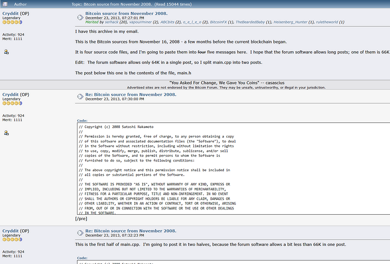 In 2013 Ray Dillinger (aka Bear, aka Cryddit) posted a 2008 email copy to Bitcointalk, allegedly from Satoshi Nakamoto… The email apparently contained the source code of Bitcoin, from November 2008. Pre-dating the first release of Bitcoin v0.01 source code, released January 2009…
