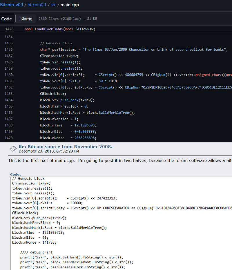There are several significant changes when we compare this 2008 pre-alpha source code to the 2009 Bitcoin v0.1 source code. A big one being the genesis block hash. There is no "The Times" article headline, as this headline did not yet exist. A hash starting with "0x31" is used instead of "0x5f" (from the v0.01 "The Times" genesis block).