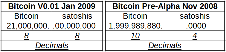 But wait, you ask, how can there be more bitcoin in this first draft, but less satoshis too? Answer: notice the decimal place difference here. In this pre-alpha of Bitcoin (2008), only four decimal places for satoshis are proposed, instead of the eight seen in v0.1 (2009). And the coinbase reward was also significantly larger at 10,000 bitcoin per block, instead of just 50.