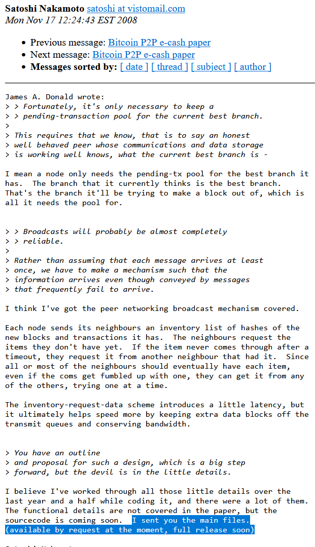 But, in support of Dillinger's testimony, there is email evidence from Satoshi himself, suggesting he had code ready for review that he was willing to share in November of 2008.But, in support of Dillinger's testimony, there is email evidence from Satoshi himself, suggesting he had code ready for review that he was willing to share in November of 2008.