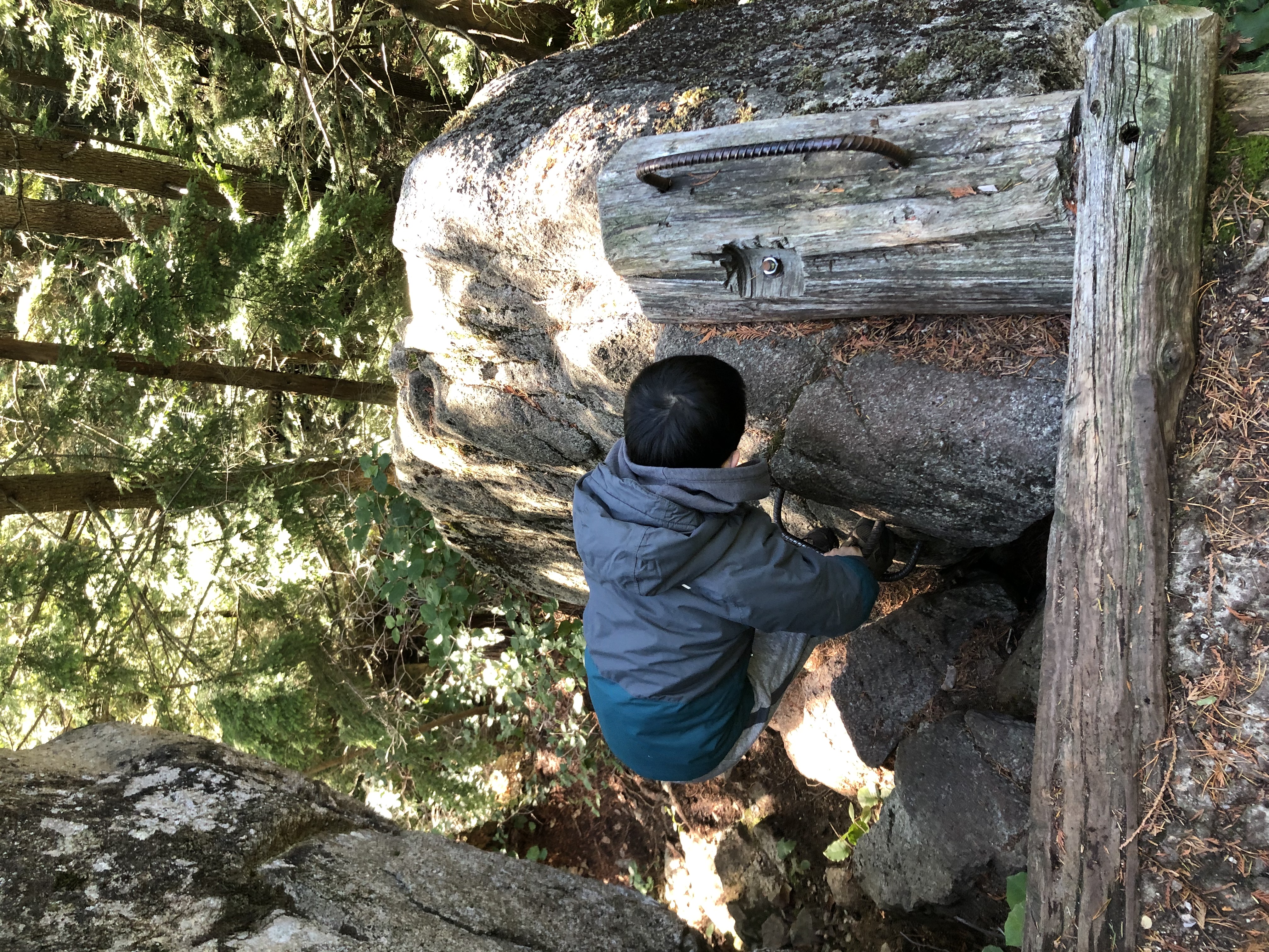 My son climbing down a makeshift ladder made out of rebar