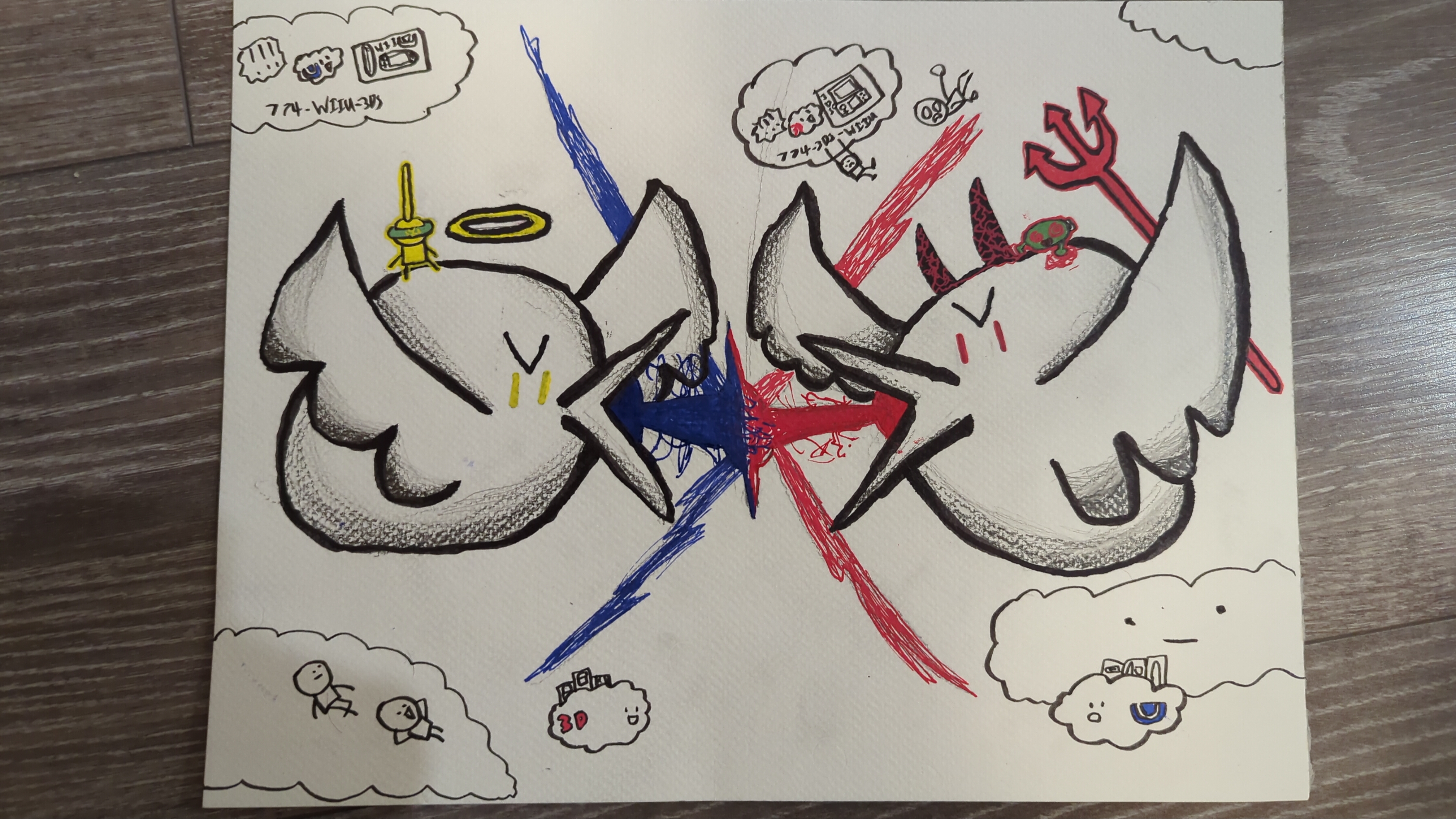 In the clouds above Akhzablar... The Lollipop was questioning this. He'd trained his whole life for this moment, and standing across from him on the Devil Bird... was the Twisted Blob. The Twisted Blob had turned to the dark side by learning the ways of the Twisted. He glowed red with power... and The Lollipop glowed yellow. This was it. "You ready?" he asked, not worrying about it. The Angel bird nodded. He had seen the past, present, and future. As the Devil Bird blasted a beam out of his mouth, so did the Angel Bird. The beams collided with power, and sparks flew everywhere. Everything seemed... TIMELESS. The Wii U cloud below them watched with amazement, while trying to sell people Wii Us. The 3DS cloud did the same, except with 3DS's.