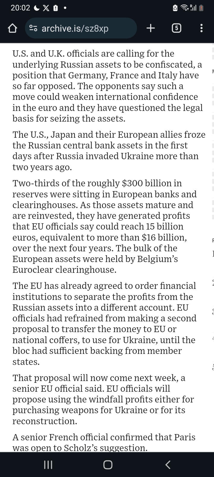 What they are doing represents a significantly smaller step taken (but still a grossly stupid and criminal one) than actually liquidating the frozen assets. Euroclear, the authority that actually holds over 70% of the frozen assets, had previously given the ok for using the interest paid on the assets but is still, very strongly, warning against the liquidation, i.e. full seizing, of the assets. Because Euroclear recognises, correctly, that seizing the assets will have catastrophic consequences for Europe as a financial centre.