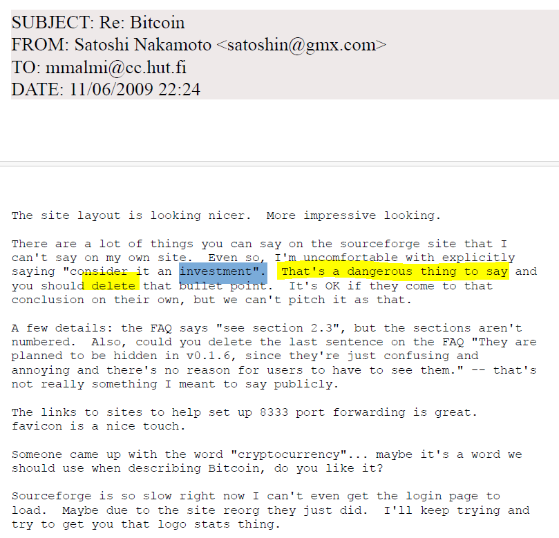 Satoshi is not saying it is not an investment. This was about promotion. The reference is to the hammer of the Fed. regulators. If you call it an investment you have to register it and representatives, etc.