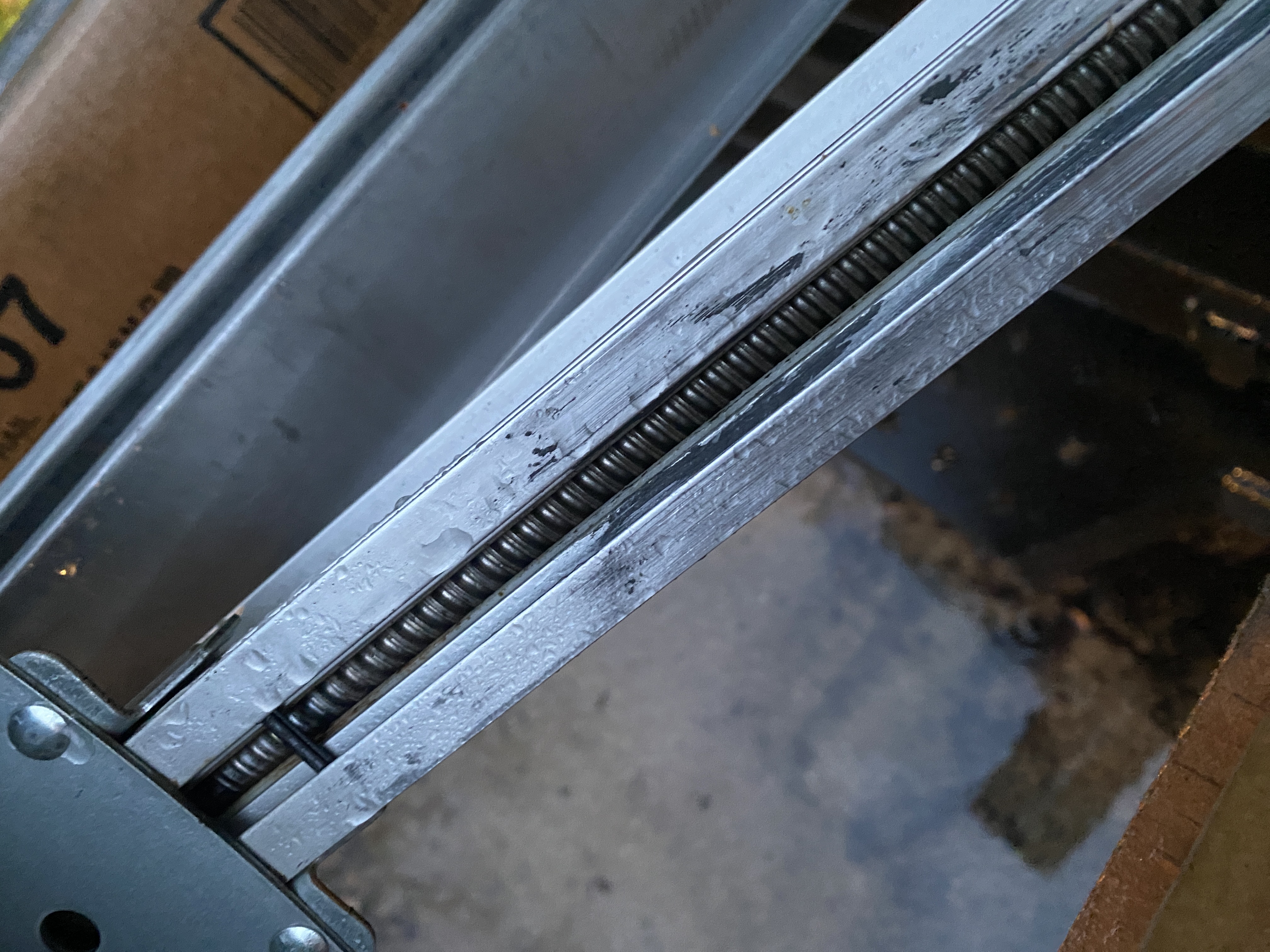There is a tiny plastic coupler piece that allows the motor spinning the screw drive sprocket to spin the long screw hidden inside the rail. Sometimes this little plastic piece breaks. It's made of plastic. It will break eventually.