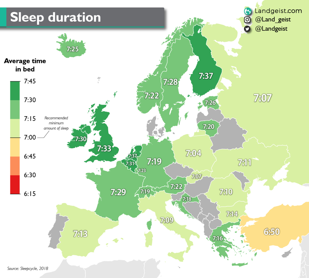 People in Finland and the Netherlands get the most sleep. Both spend an average of 7:37 hours in bed. People in Belgium, Ireland and the UK also get at least 7.5 hours of sleep every day.