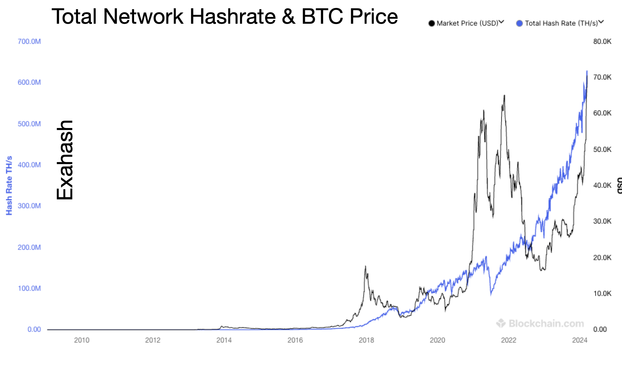 - The total network computing power (Hashrate) is measured in Exahash or quintillions of hashes per second. Bitcoin price and Hashrate have generally increased in tandem as a higher price incentivizes miners do deploy more mining machines.